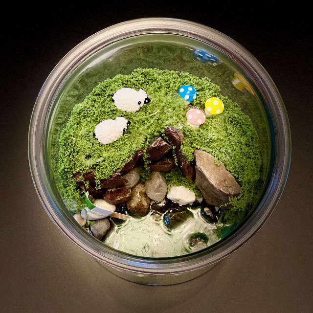 A miniature coastline captured in glass, where sheer cliffs drop dramatically into a green, mossy “sea” below. Smooth stones rest at the base like weathered rocks kissed by waves, while above, soft pastures bloom with tiny mushrooms and grazing sheep. Set within a wide, open-mouthed jar, this scene feels alive with sea breeze and story, an Irish landscape in miniature, ready to bring a touch of wild serenity to any shelf or desk.