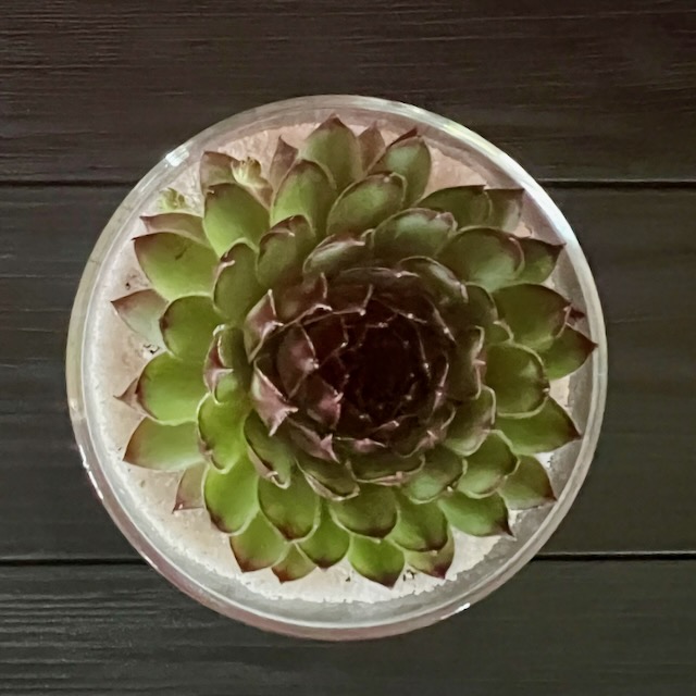 Indulge your senses with Creamy Dessert 🍨✨ a tiny treat for the eyes and the soul. A single rosette-shaped Sempervivum sits atop layers of coloured sand, its green leaves kissed with burgundy like a swirl of rich chocolate on a delicate pastry.