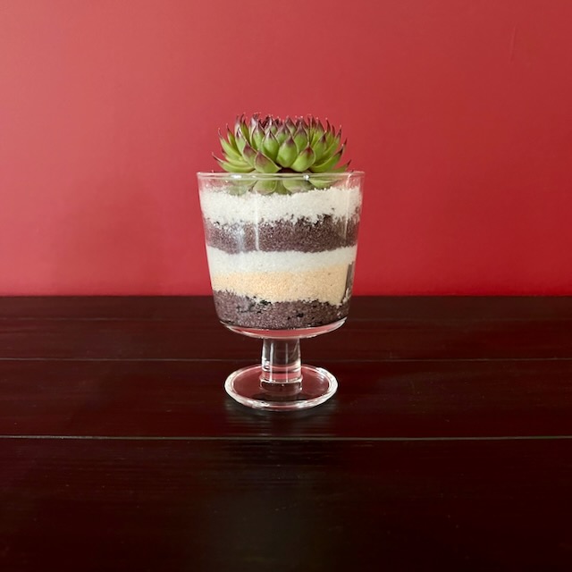 Treat yourself to Creamy Dessert 🍨💫 a rosette-shaped Sempervivum perched atop layers of dark cocoa, caramel, chocolate, and whipped-cream-white sand. Encased in a stemmed glass goblet, its green and burgundy leaves spiral like a piped swirl, bringing a touch of sweetness and magic to any space 🌿✨