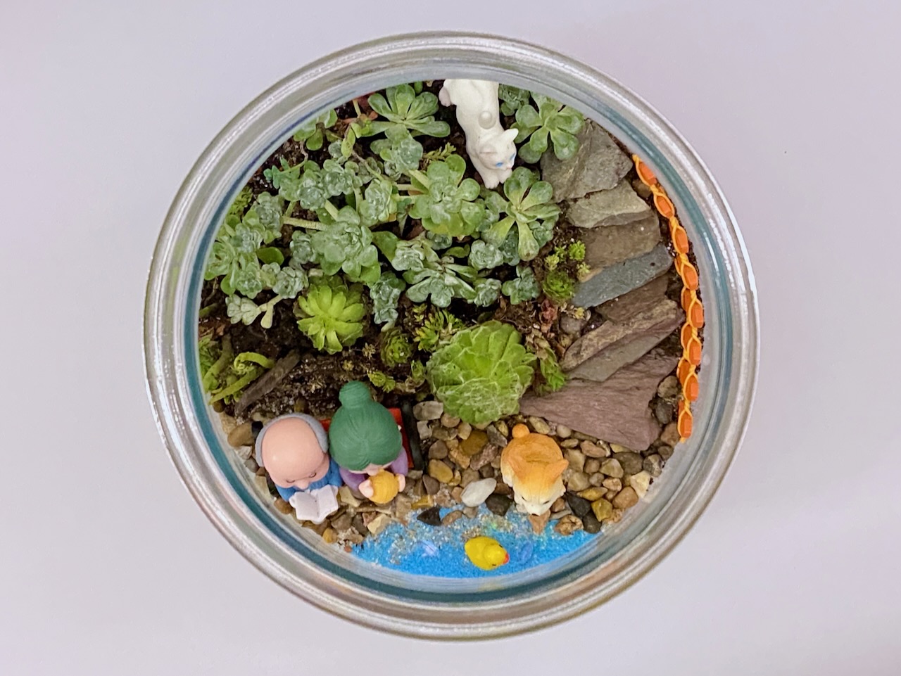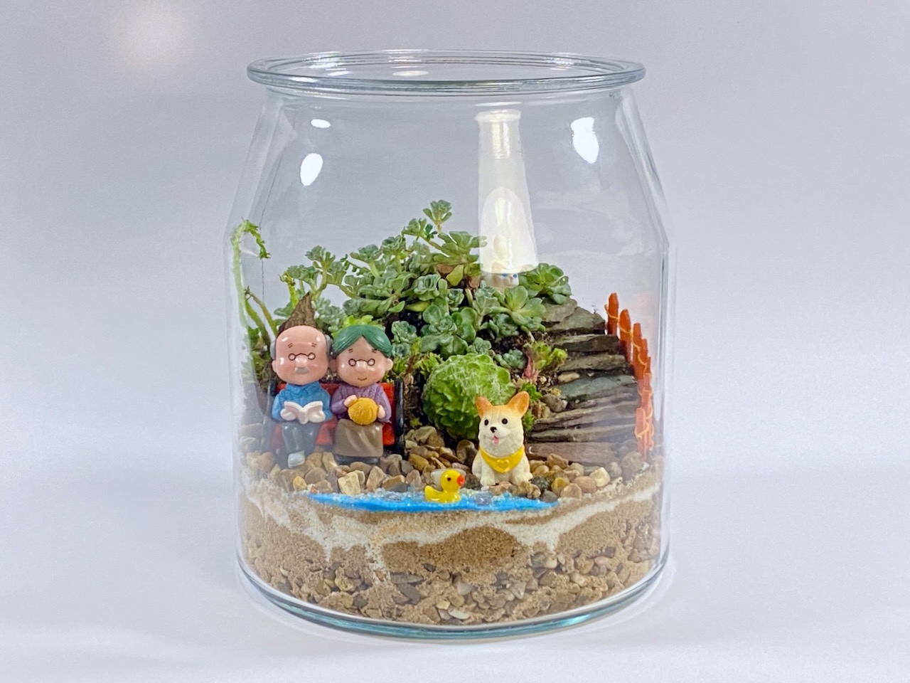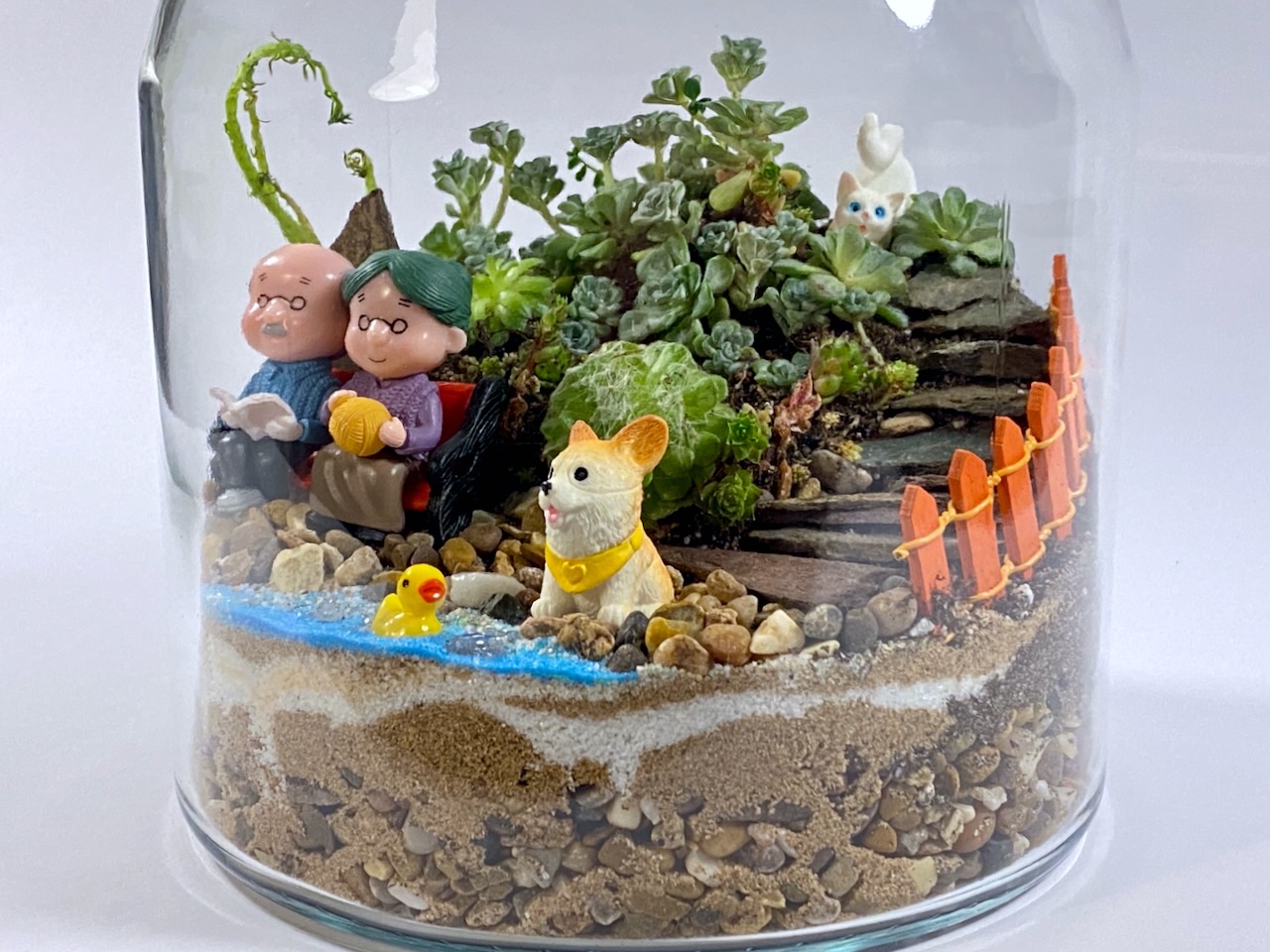 A peaceful little world under glass, filled with hardy succulents and a heartwarming scene of an elderly couple, their cheerful Corgi, a tiny duck, and a hidden white cat. Everlasting Serenity adds a calm, storybook charm to any space with almost no maintenance. 🌿💛