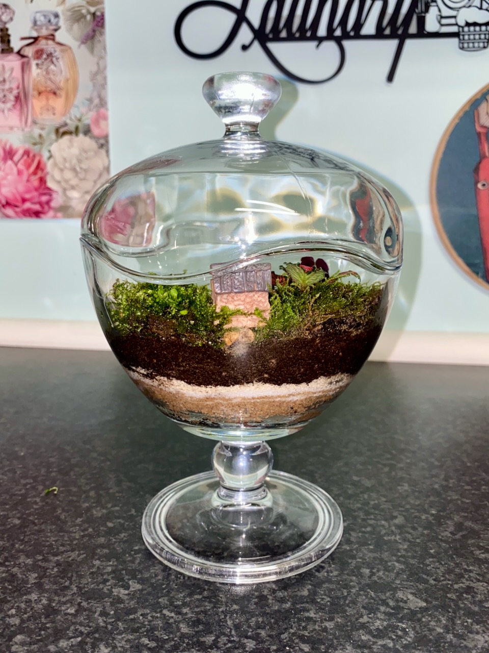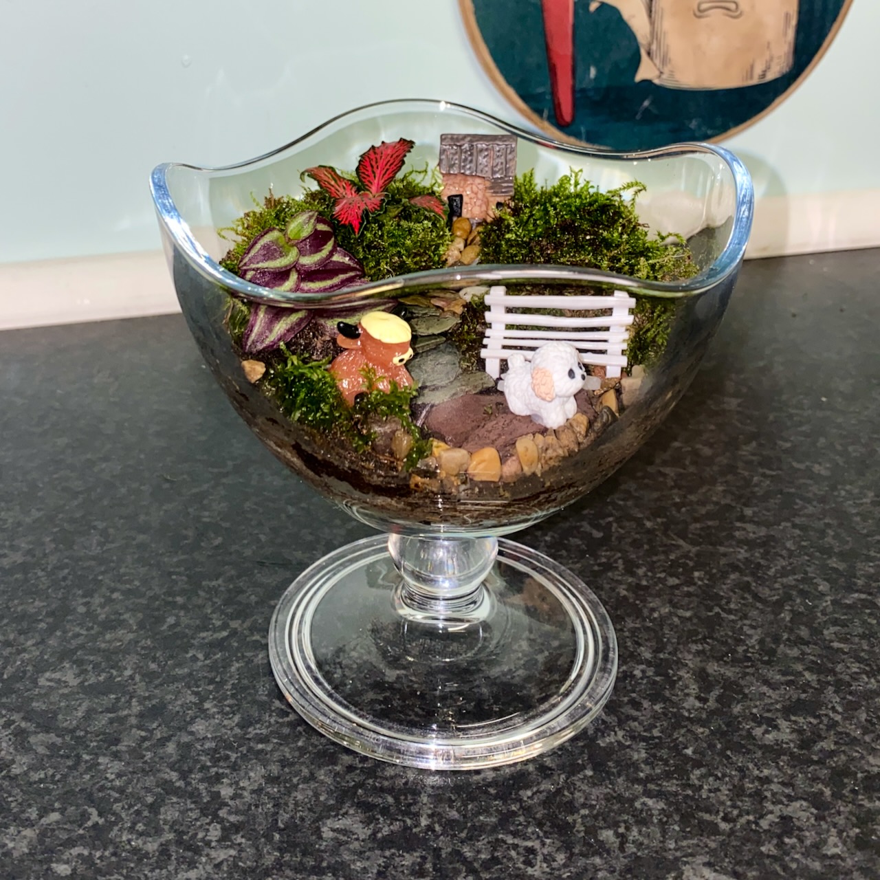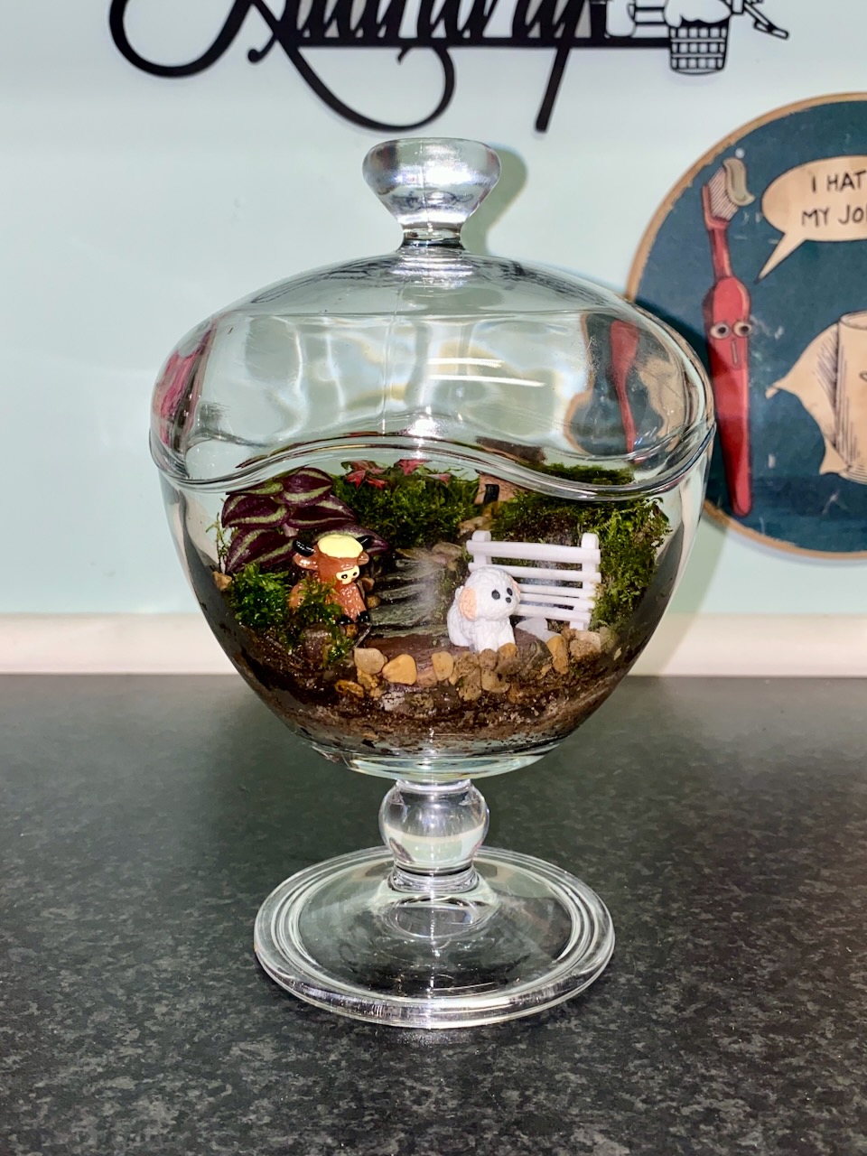 Step into a teeny-tiny world bursting with cosy vibes and pure fluffiness! 💖 This charming terrarium-in-a-goblet stands a proud 20cm tall, holding a whole storybook scene under its elegant glass lid. 🌱✨