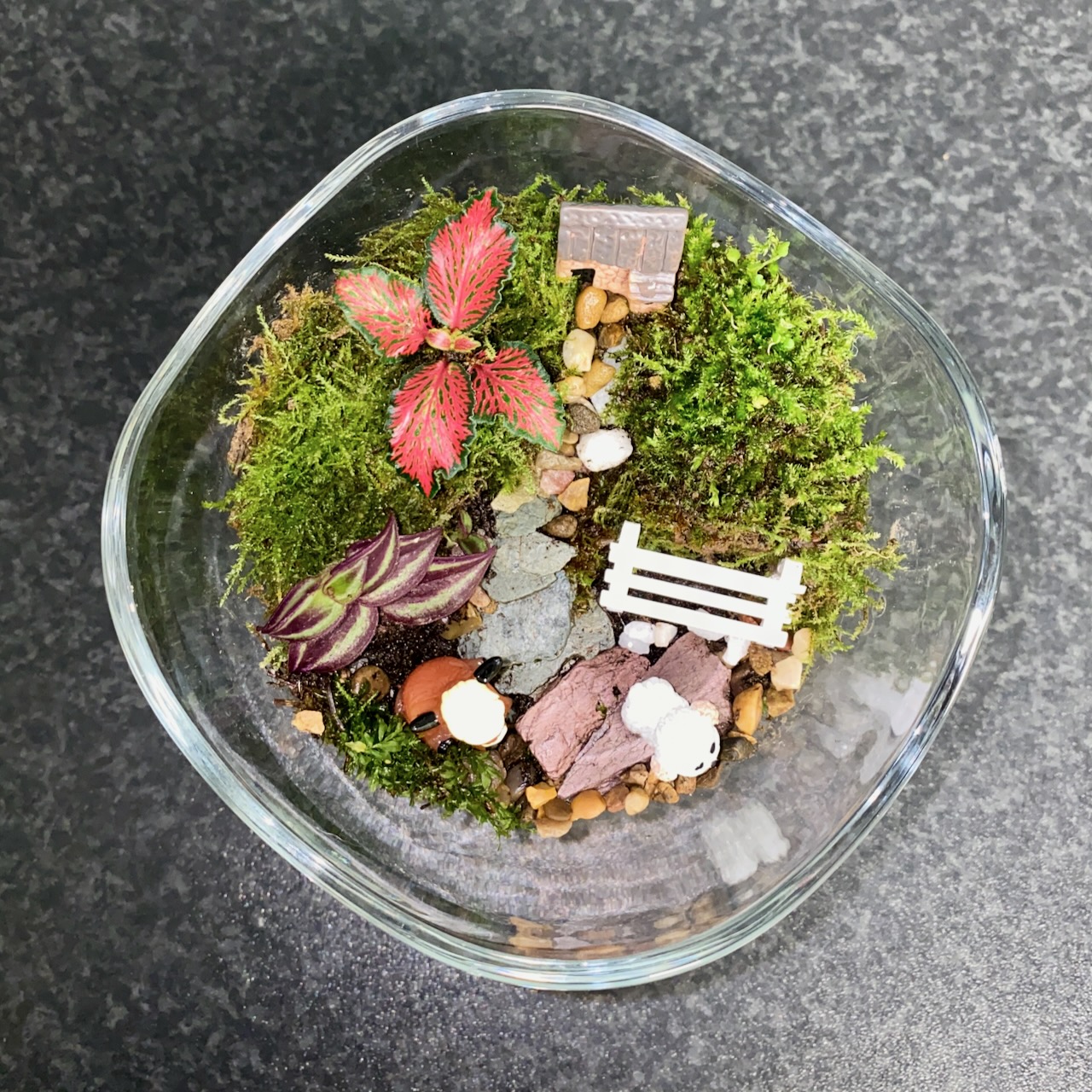 The landscape pops with colour thanks to a vibrant Pink Fittonia 🌸 and a deep purple succulent 💜, adding a magical splash to the lush green hills. The lid keeps everything snug, dewy, and full of that tiny-world wonder. 🌫️✨