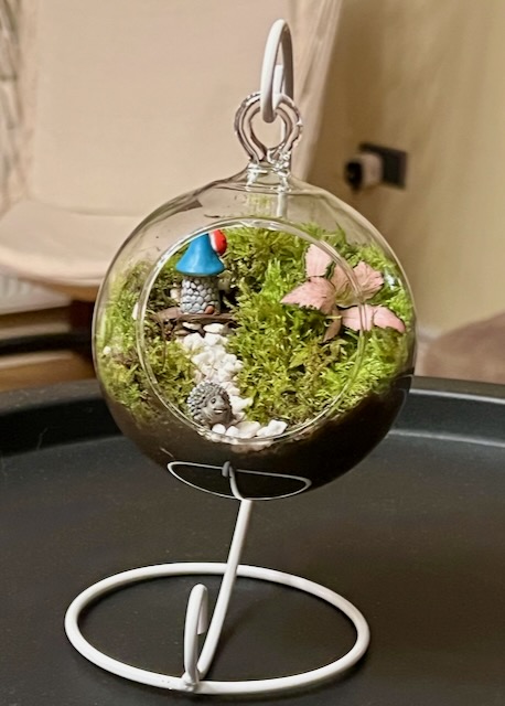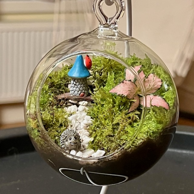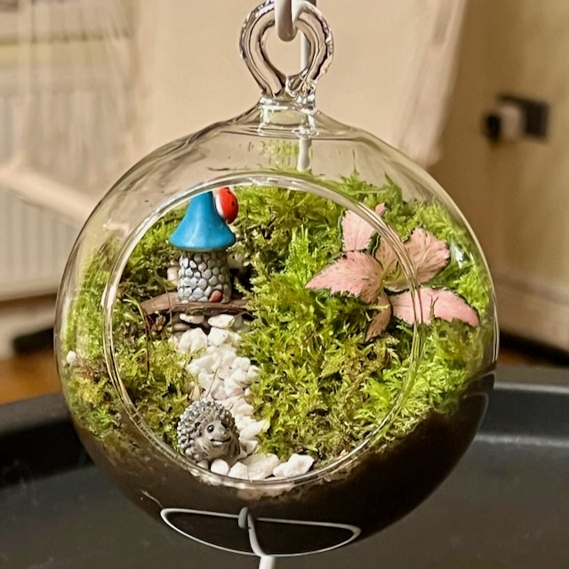 Step into a tiny world of woodland wonder with Happy Hedgehog. Inside this hanging glass globe, a joyful little scene unfolds — soft green moss carpets the ground, scattered with smooth white pebbles that trace a gentle path.