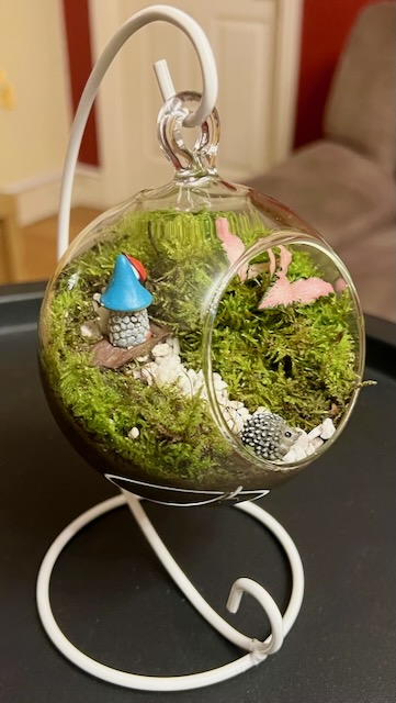 Suspended from a simple white stand, this little world feels as though it’s floating — a peaceful reminder to pause, smile, and find joy in life’s smallest moments.
