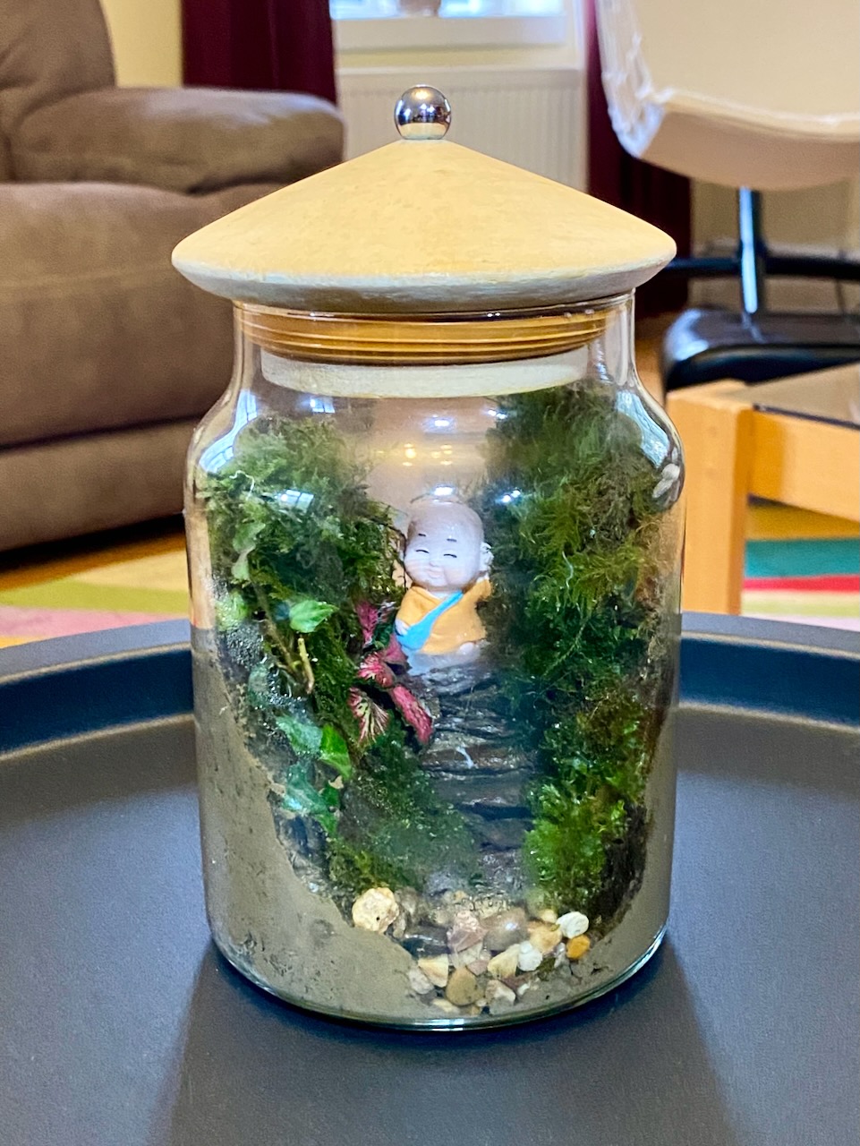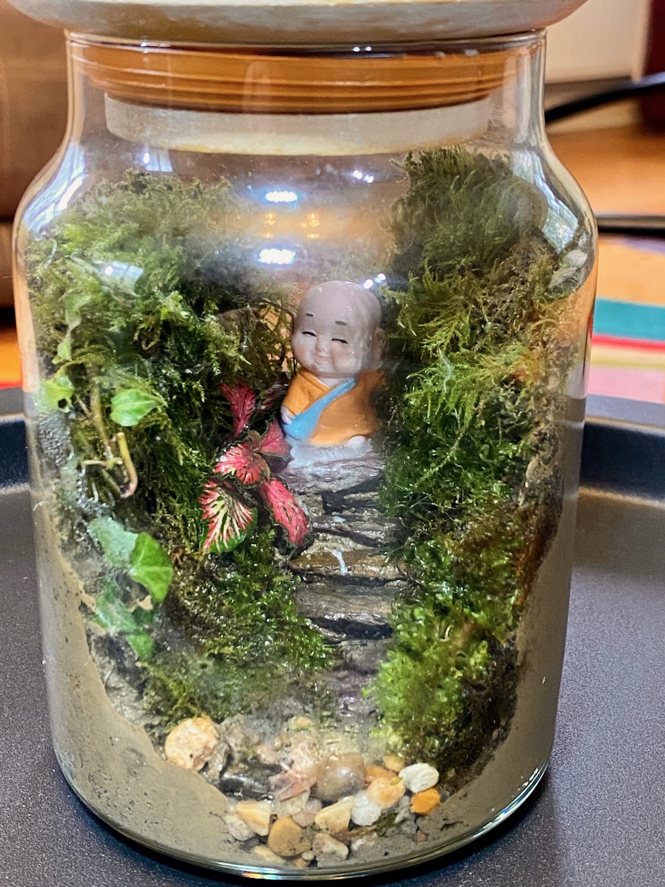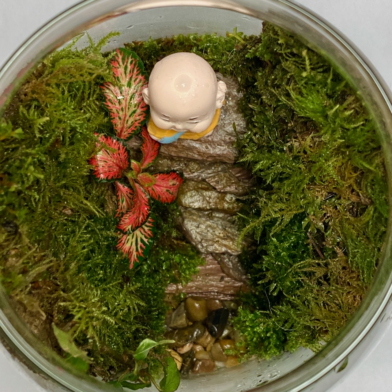 Mini Zen Bliss 🌿😊 – A tiny, self-sustaining forest in a jar, featuring a smiling Baby Monk, lush green moss, and a splash of colorful foliage. Calm, cute, and low-maintenance—a perfect little escape for your desk, shelf, or as a thoughtful gift.