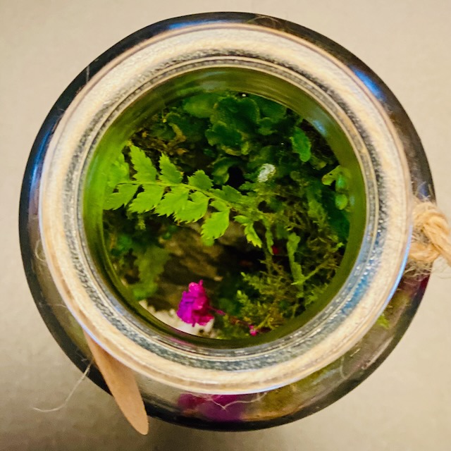 A hidden staircase winds through soil and pebbles, disappearing into lush foliage – your tiny jar of mystery and wonder.