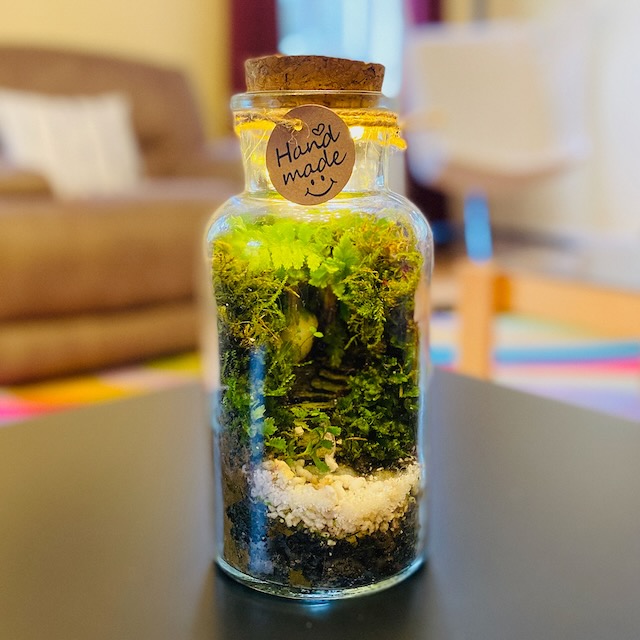 Step into a tiny world of intrigue with this 17 cm glass jar terrarium. A slender corked vessel holds a delicate bed of soil topped with smooth white pebbles, while a hidden staircase of flat stones winds upward along the side, vanishing mysteriously into the lush foliage. What lies at the top? That’s for your imagination to decide. Perfect for desks, shelves, or any spot that could use a touch of wonder, this little jar invites curiosity, quiet reflection, and a hint of adventure.