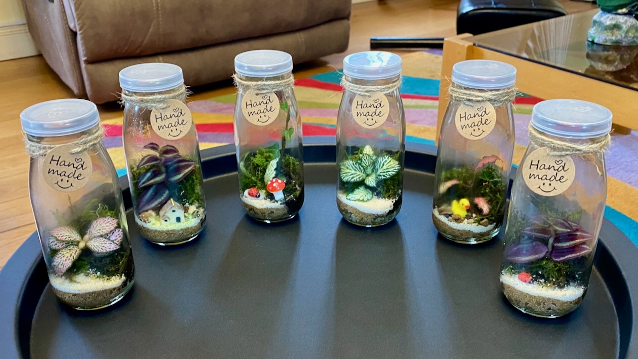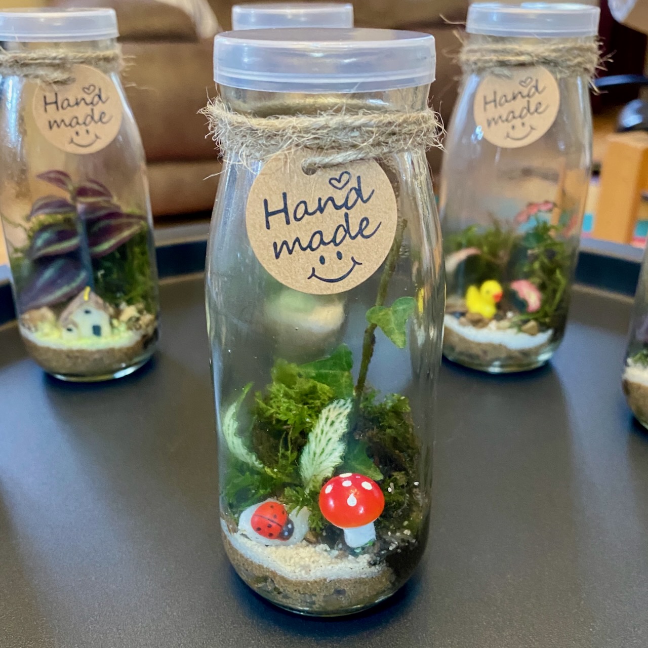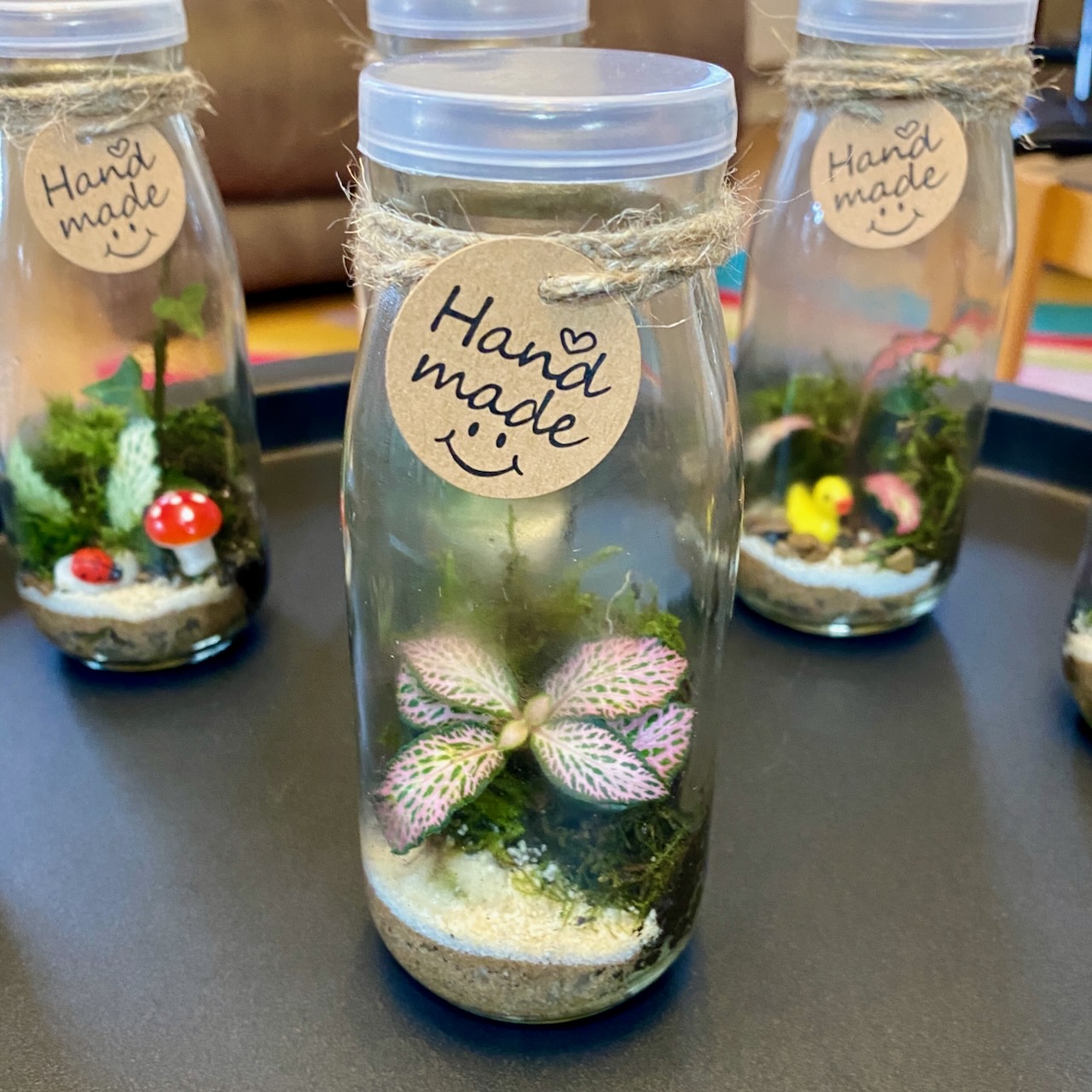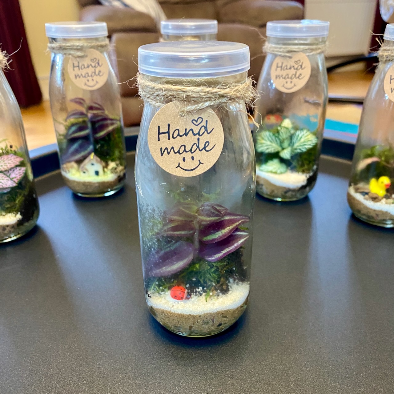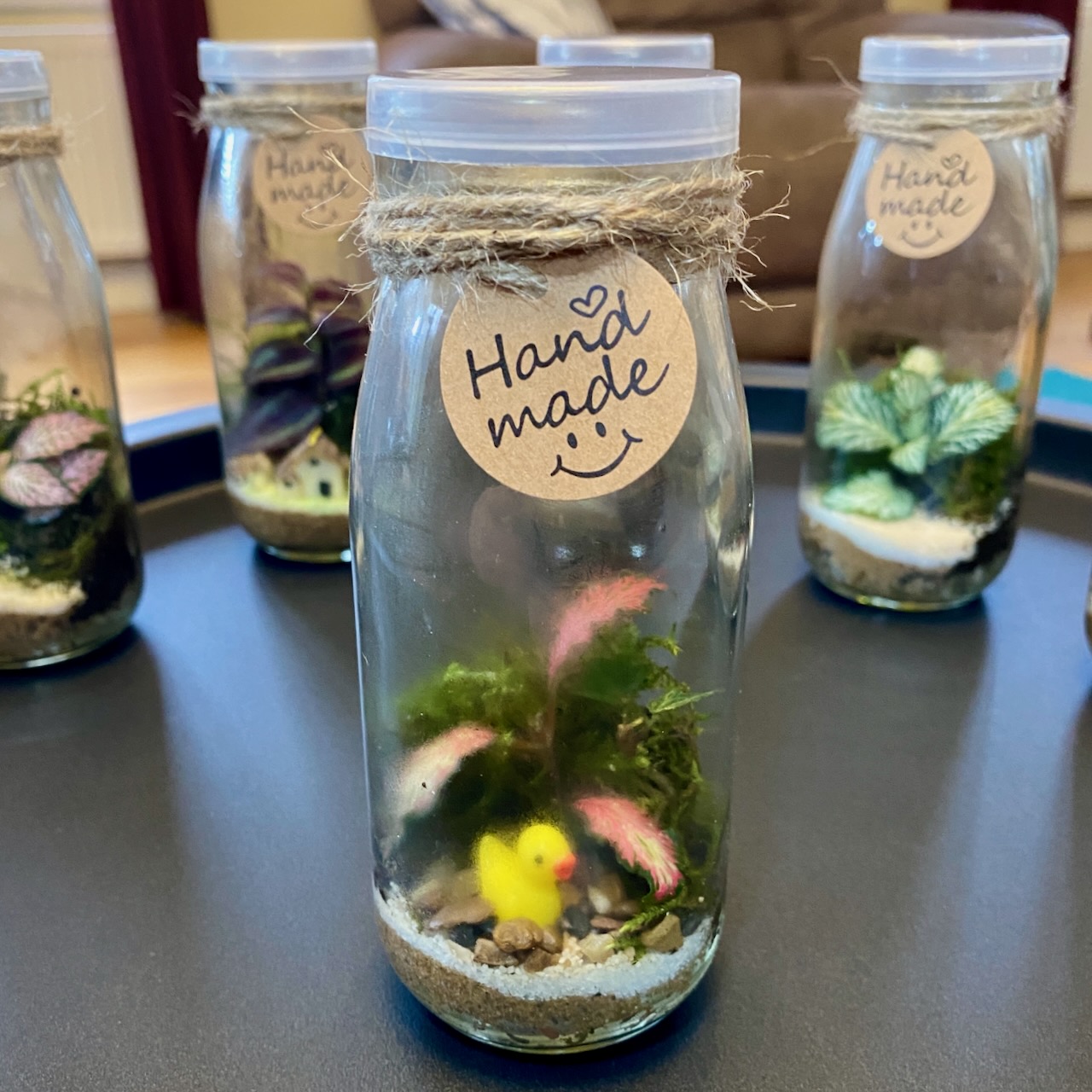Peek inside and you’ll find a whimsical scene full of life: soft sand giving way to lush, green moss, vibrant plants in every shade from deep purple to pink-veined and striped foliage 🌸💜🌱. But the real joy is in the tiny details 🤫 — a teeny house, a cheerful mushroom, a bright yellow ducky, or another secret surprise waiting to be discovered! Each jar is totally unique.