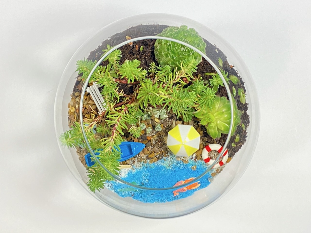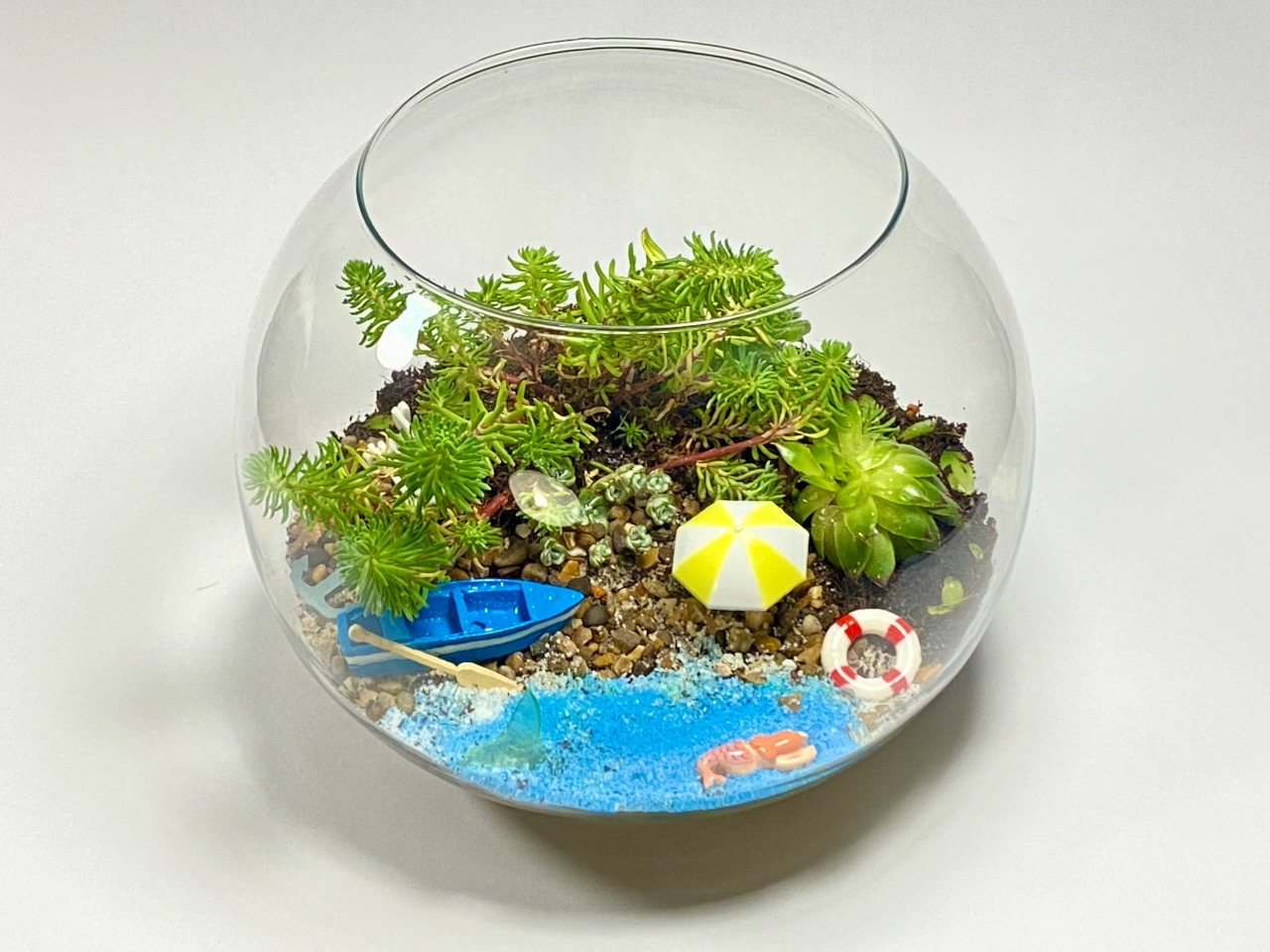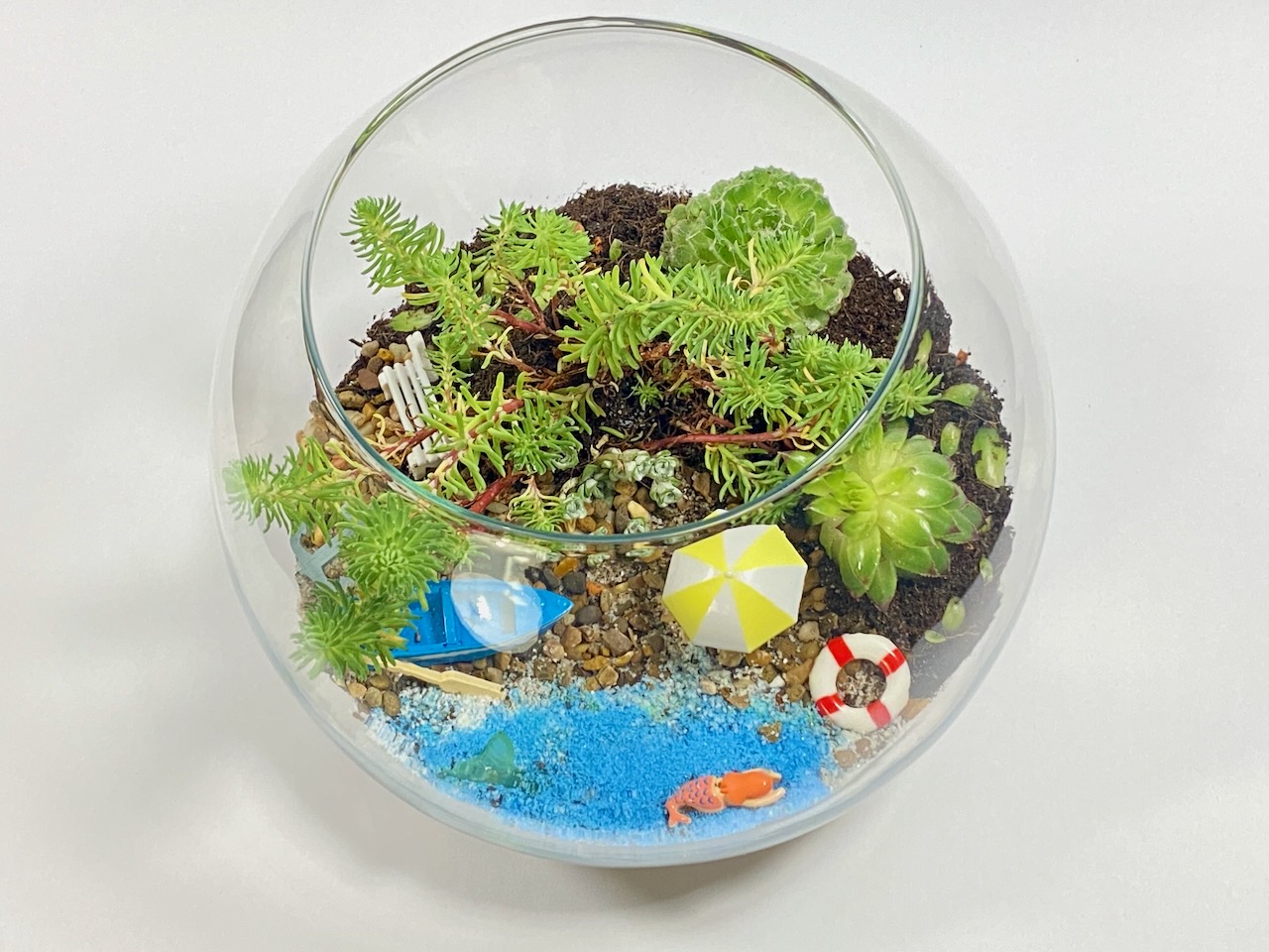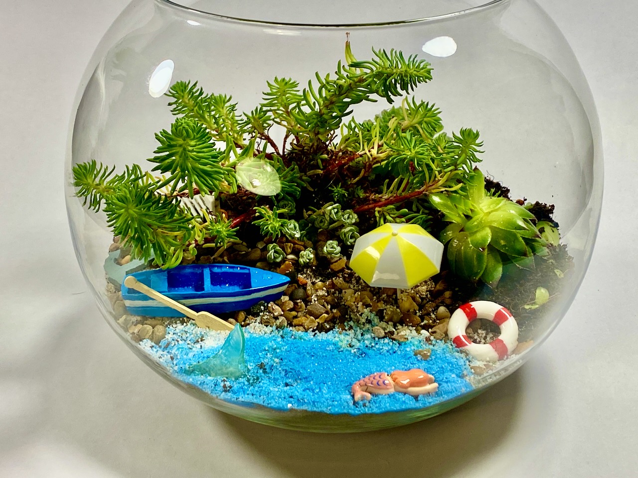 The lush, green foliage is a cheerful mix of easy-going succulents, including a vibrant trailing variety that looks like miniature palm trees and a chunky rosette succulent soaking up the sun. Providing shade and a pop of colour is a cute yellow-and-white striped beach umbrella ⛱️, while a miniature red-and-white life preserver ring stands by for any emergencies (mostly just emergency cuteness). The whole scene sits inside a clear, round glass bowl that gives you a perfect 360° view of your endless summer.