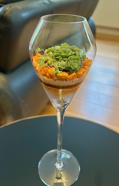 A golden-hour terrarium in a glass — warm layers of sand and stone topped with a fresh green succulent. Nature’s own cocktail of calm. 🍸🌅