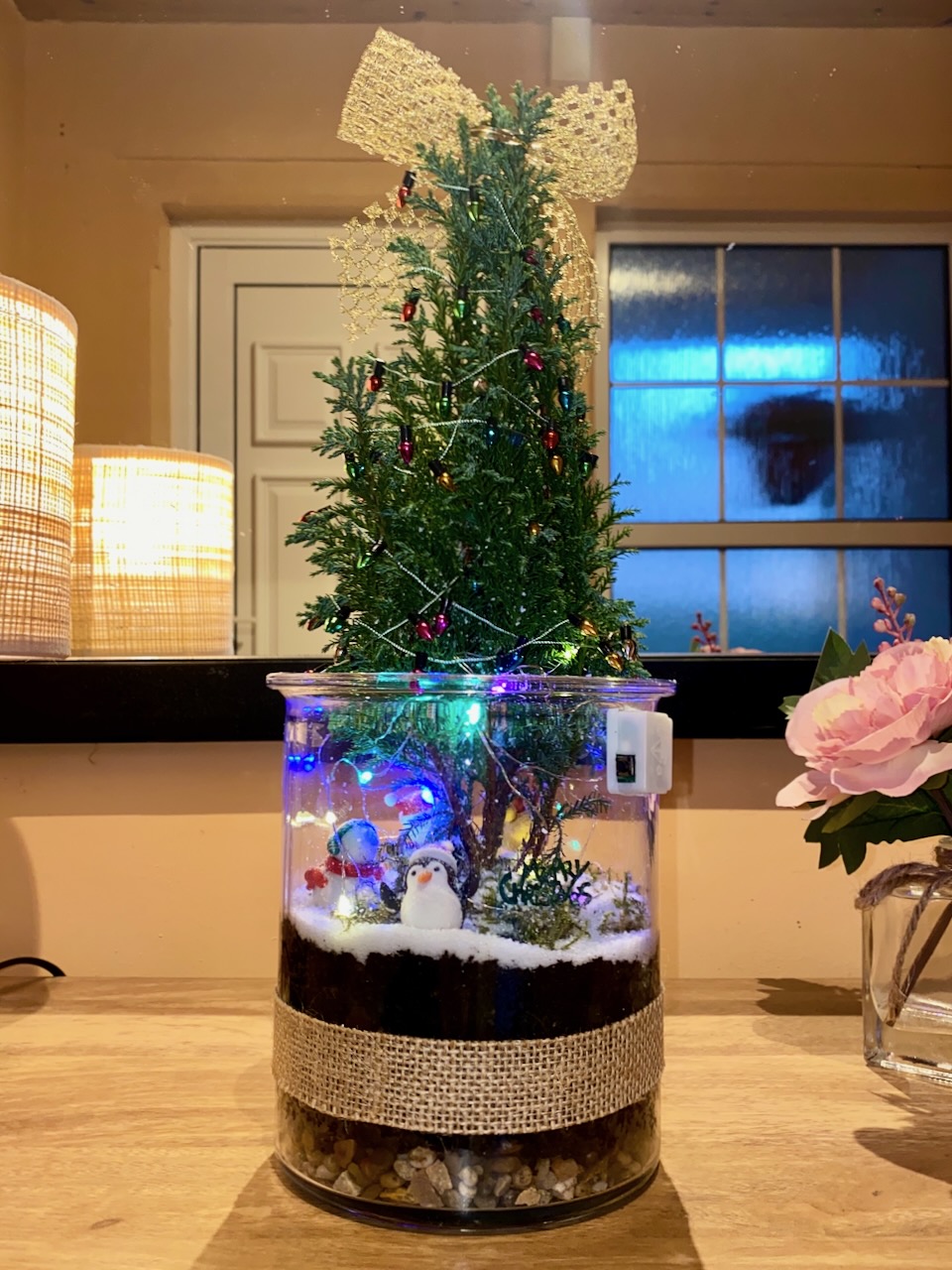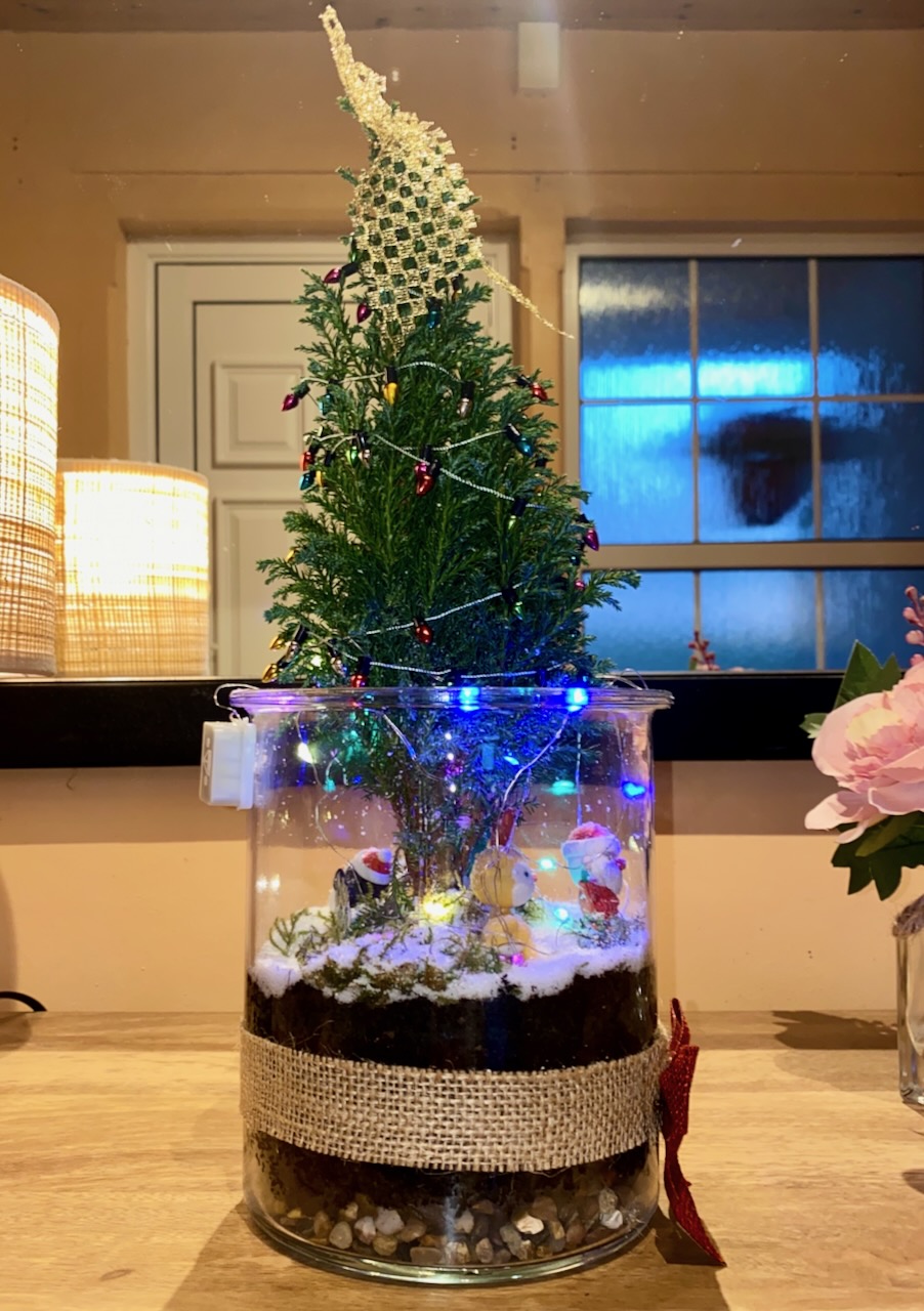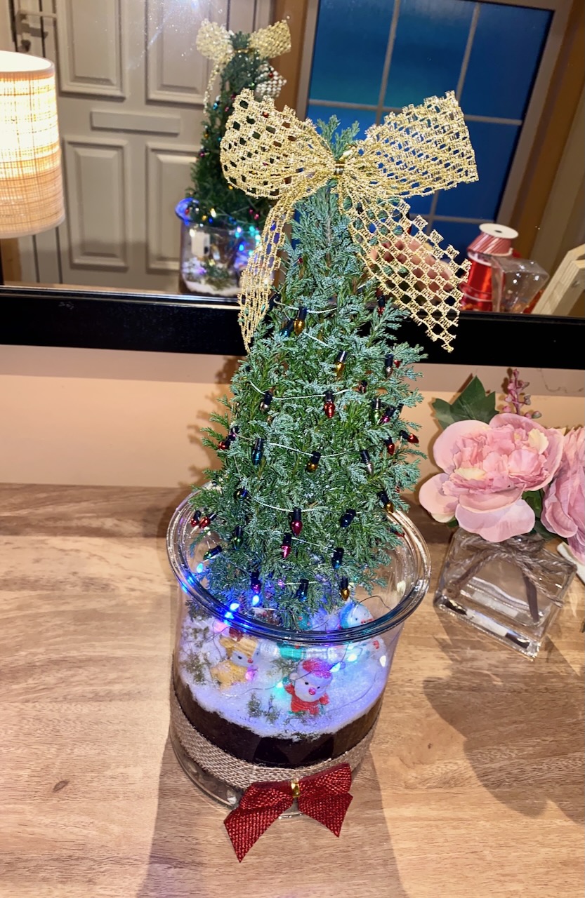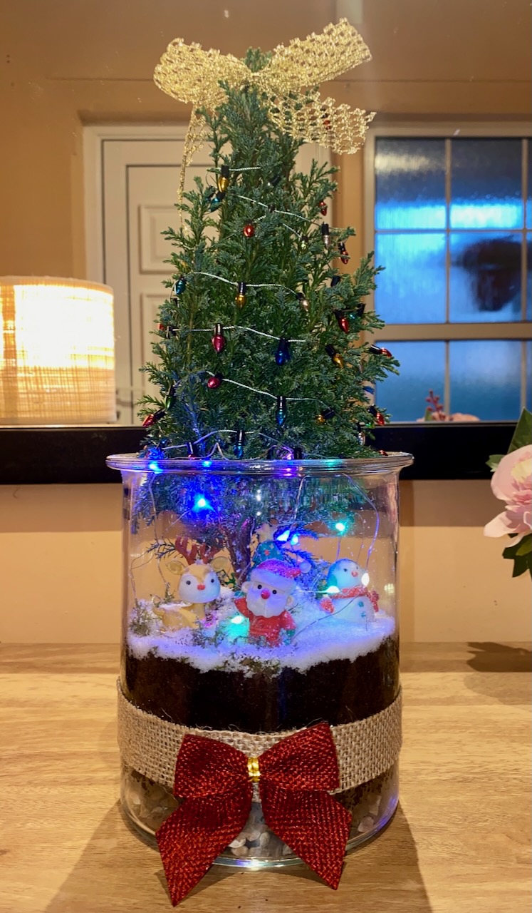 Inside the glass world, a proud little Christmas tree takes centre stage, dressed in a golden bow and wrapped in twinkly, multi-coloured lights that make everything shimmer. 🎄✨