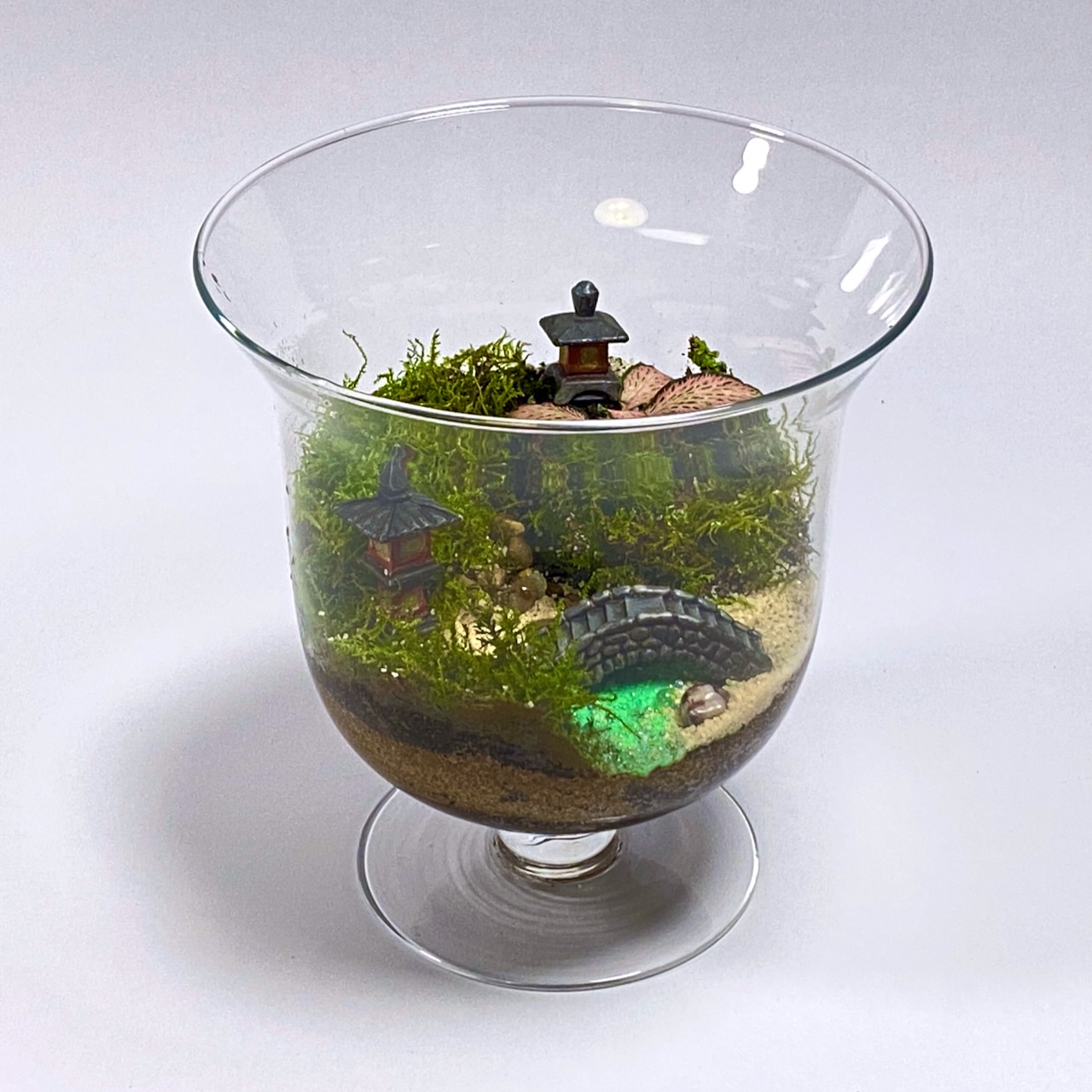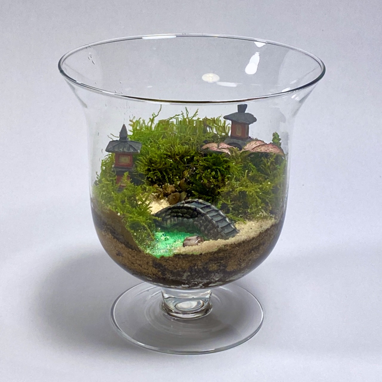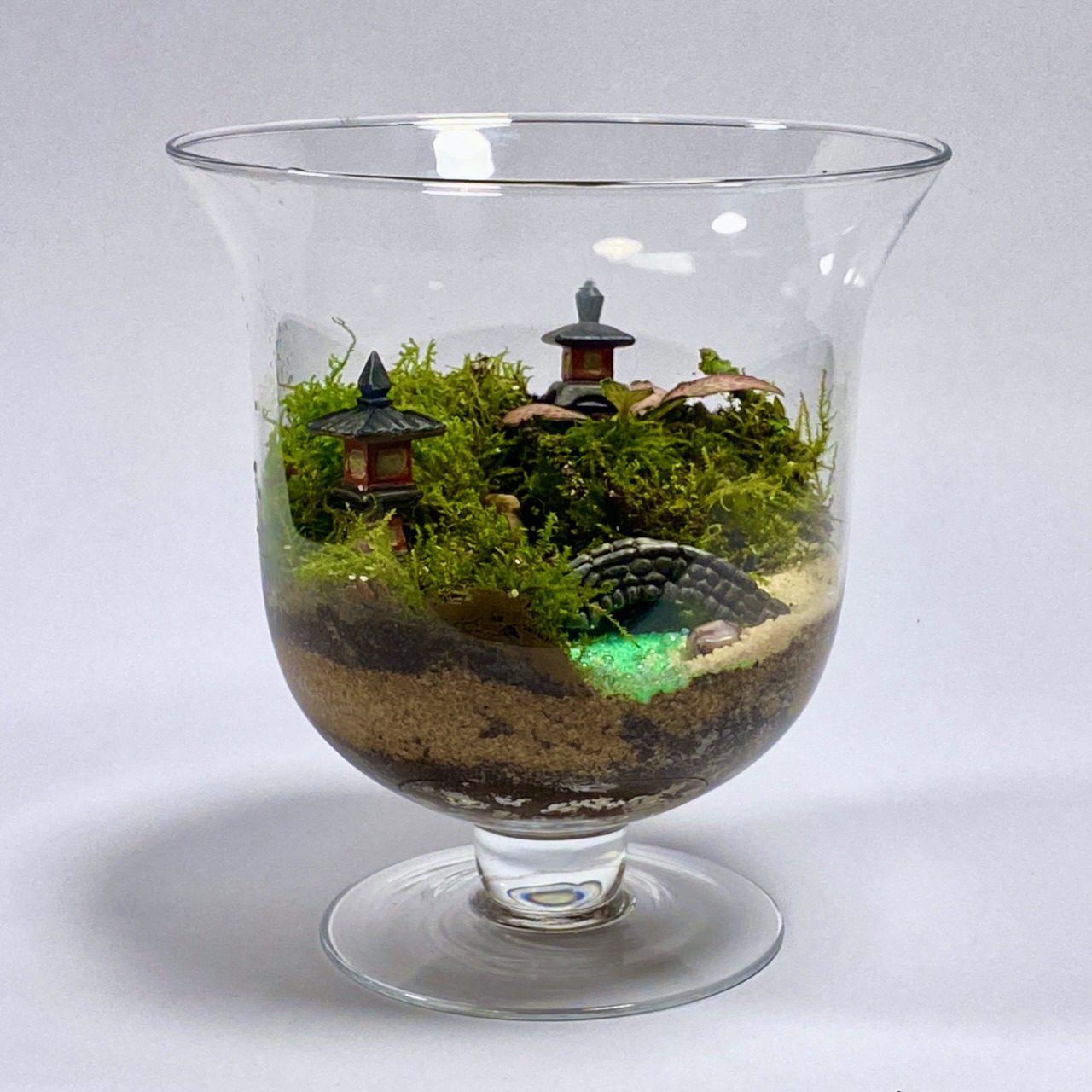 A tiny, enchanting world in a glass goblet, featuring lush mossy hills, a glowing green pond 💚 charming pagodas 🏯 and a splash of colourful foliage 🌸. Low-maintenance, whimsical, and perfect for adding a touch of magic to your desk, shelf, or cosy nook! ✨🌿💖