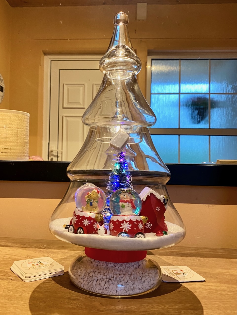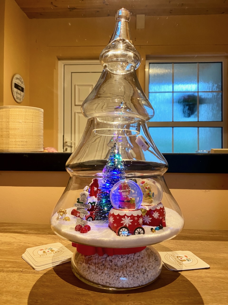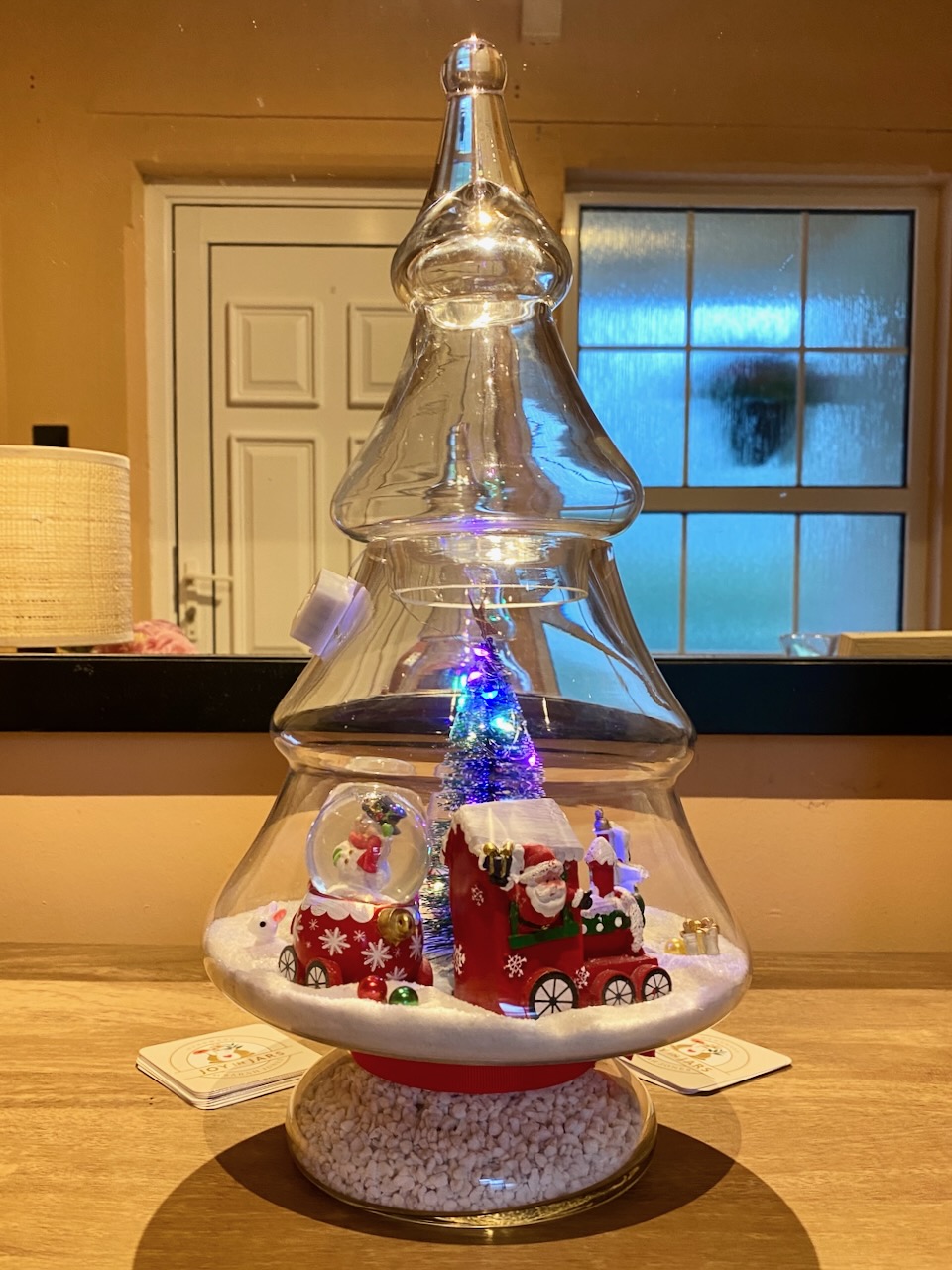 All aboard the festive fun! This towering glass tree holds a glowing Christmas scene, complete with a cheerful train and three miniature snow globes tucked into its carriages. 🚂❄️ A sprinkle of snow, hidden presents, and plenty of sparkle make it the perfect showstopper for your holiday display. 🌟